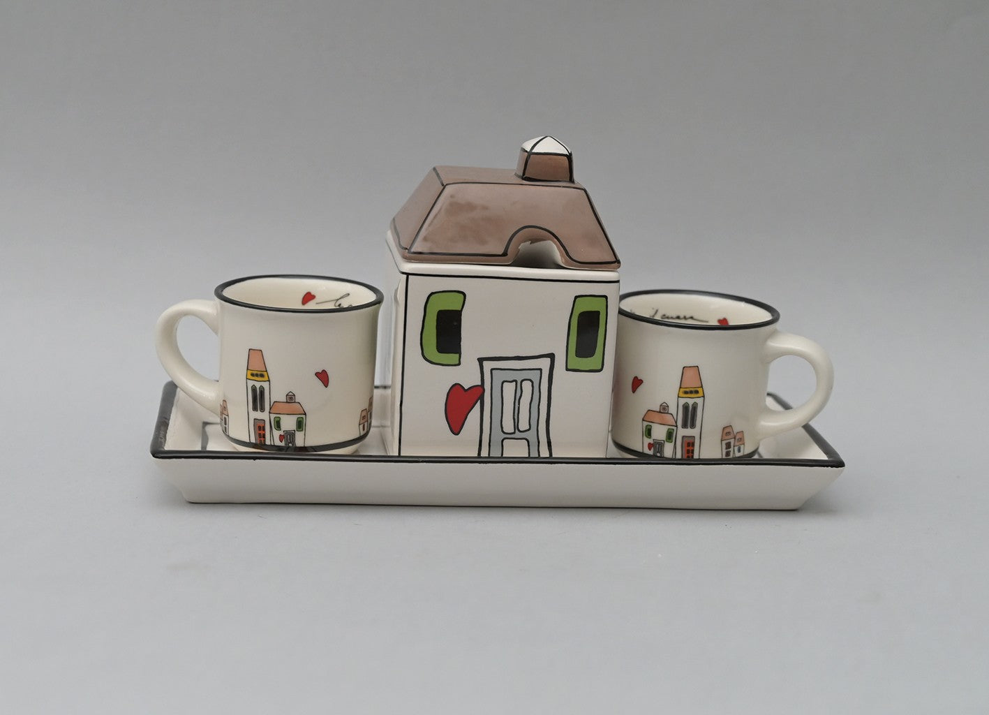 - Design: Elegante set che include un vassoio, 2 tazze e una zuccheriera, tutti decorati con il tema casette.