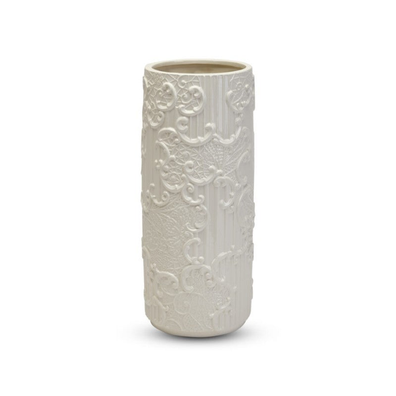Aggiungi un tocco di eleganza alla tua casa con il Vaso Cilindrico in Ceramica Bianca “Dentelle”. Realizzato in ceramica di alta qualità, questo vaso presenta un meraviglioso decoro in rilievo tono su tono che lo rende un pezzo unico e raffinato. Perfetto per esporre fiori freschi o secchi, o come elemento decorativo da solo, il vaso “Dentelle” è l’accessorio ideale per qualsiasi ambiente. Inoltre, è confezionato in una box intestata, rendendolo una splendida idea regalo. La linea “Dentelle” offre anche altri prodotti coordinati, permettendoti di creare un set completo per la tua casa.
